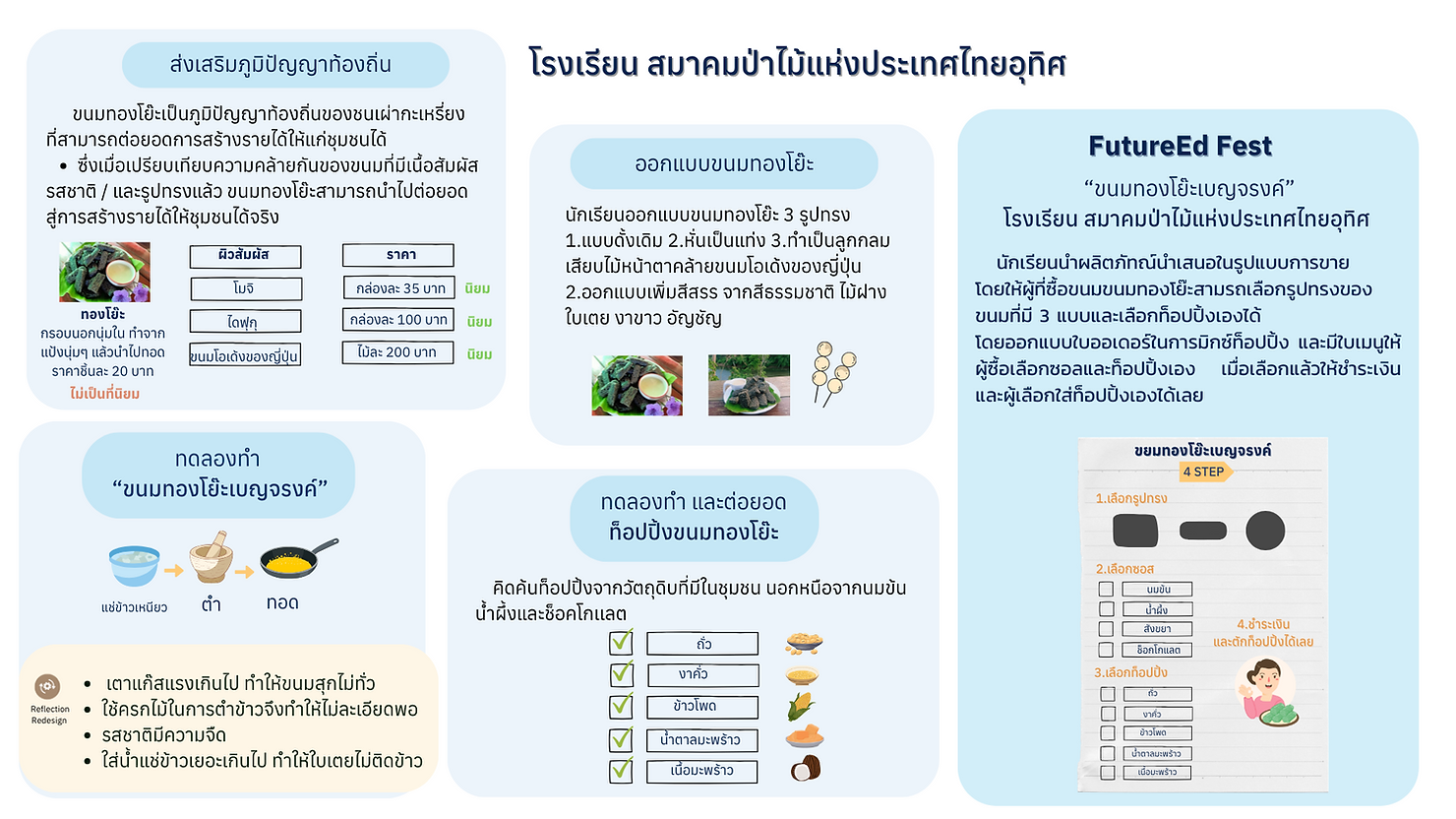 ด้วยความหลากหลายทางชาติพันธุ์ของนักเรียนในโรงเรียนสิ่งที่พบเห็นทั่วไปคงไม่พ้นเรื่องอาหารการกิน เสื้อผ้าเครื่องแต่งกายหนึ่งในนั้นคือ “หมี่สิ” หรือ ทองโย๊ะ ถือว่าเป็นอาหารหวานสำหรับพวกเขา ซึ่งเป็นวัฒนธรรมของชนเผ่ากะเหรี่ยงใช้เครื่องปรุงทีมีอยู่ในธรรมชาติใกล้ตัวผูกพันความเชื่อ อาหารบางชนิดนอกจากนำมารับประทาน ยังใช้ประกอบพิธีกรรมที่สำคัญ ๆ อาหารบางประเภทกลายเป็นสินค้าทางวัฒนธรรมที่นักท่องเที่ยวนิยมรับประทานเมื่อเดินทางมาถึงทองผาภูมิโดยสูตรดั้งเดิมของขนมทองโย๊ะนั้นจะเป็นการนำข้าวเหนียวนึ่งมาตำให้ละเอียดปั้นเป็นลูกกลมๆใส่เกลือกับงา และนำขนมไปทอดเท่านั้น ถ้าเทียบกับขนมบางชนิดในท้องตลาด เช่น โมจิ ไดฟูกุ ดังโงะ ทำจากแป้งคล้ายกันทำไมถึงมีราครสูง เด็กๆ จึงมีความคิดอยากสร้างความแตกต่างไปจากเดิมและช่วยเพิ่มมูลค่าของขนม โดยเพิ่มสีสันรูปทรงและรสชาติของขนมให้มีความหลากหลายทองโย๊ะสีธรรมชาติจากใบเตย ไม้ฝางหรืออัญชัญ ออกแบบรูปทรงให้ทันสมัย ซึ่งได้มีการทดลองทำจนได้สูตรที่ต้องการ