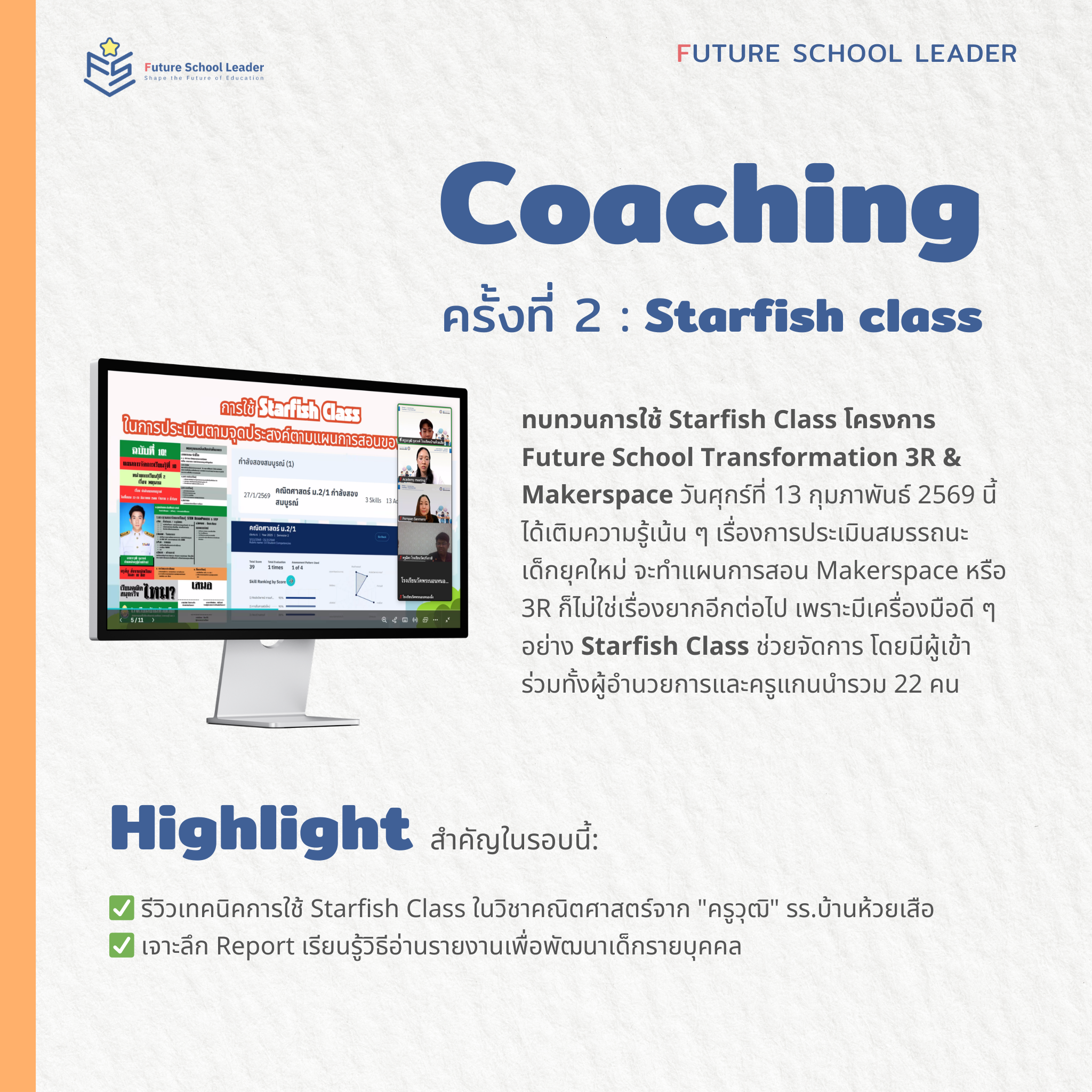 ✅ Coaching ครั้งที่ 2: Starfish Class – เจาะลึกการใช้เครื่องมือประเมินสมรรถนะเด็กยุคใหม่ ให้การทำแผนการสอนเป็นเรื่องง่ายและมีประสิทธิภาพ โดยมี ผอ. และครูแกนนำเข้าร่วมกว่า 22 ท่าน