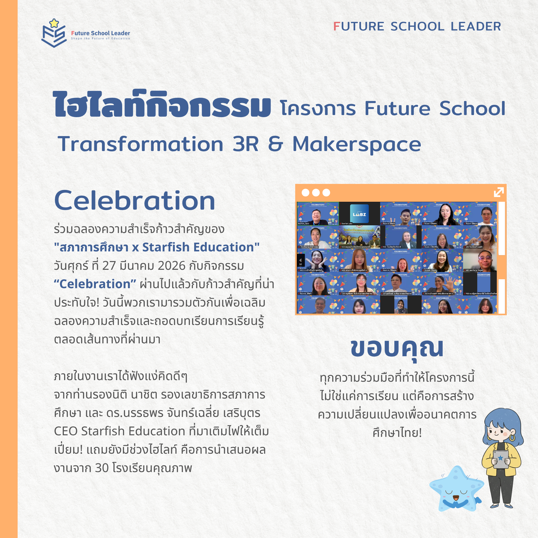 ✅ งาน "Celebration": ฉลองความสำเร็จร่วมกับสภาการศึกษา และ Starfish Education รับฟังแนวคิดดีๆ จากท่านรองนิติ นาชิต และ ดร.นรรธพร จันทร์เฉลี่ย เสริบุตร พร้อมชมผลงานจาก 30 โรงเรียนคุณภาพ